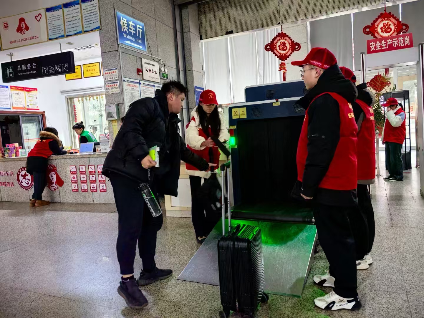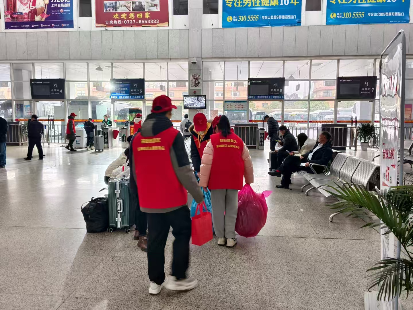 2月6日上午9點(diǎn),朝陽汽車站候車大廳隨處可見身穿紅馬甲的志愿者。他們?cè)谑燮贝翱?、安檢通道、進(jìn)出站口等人流密集區(qū)域,熱心為旅客提供購票引導(dǎo)、行李搬運(yùn)、咨詢解答等服務(wù)。