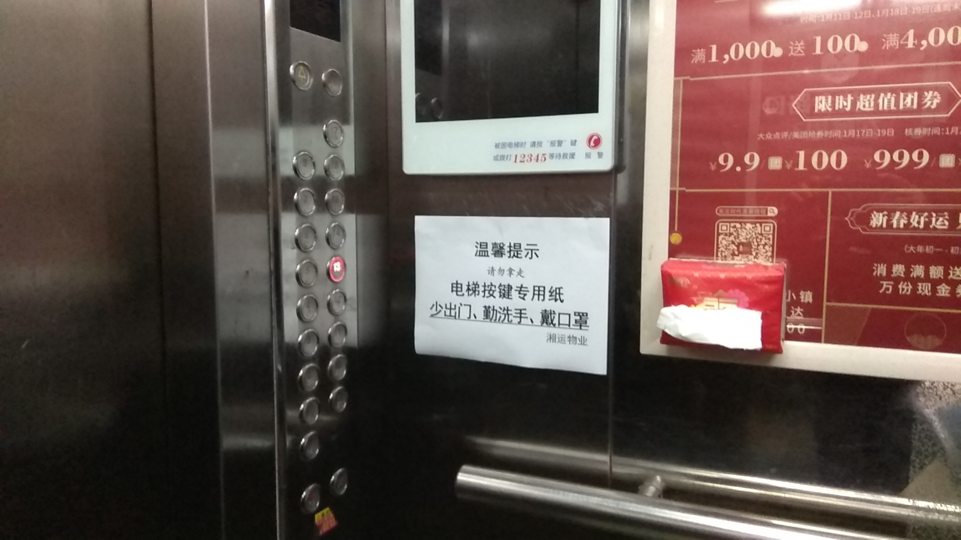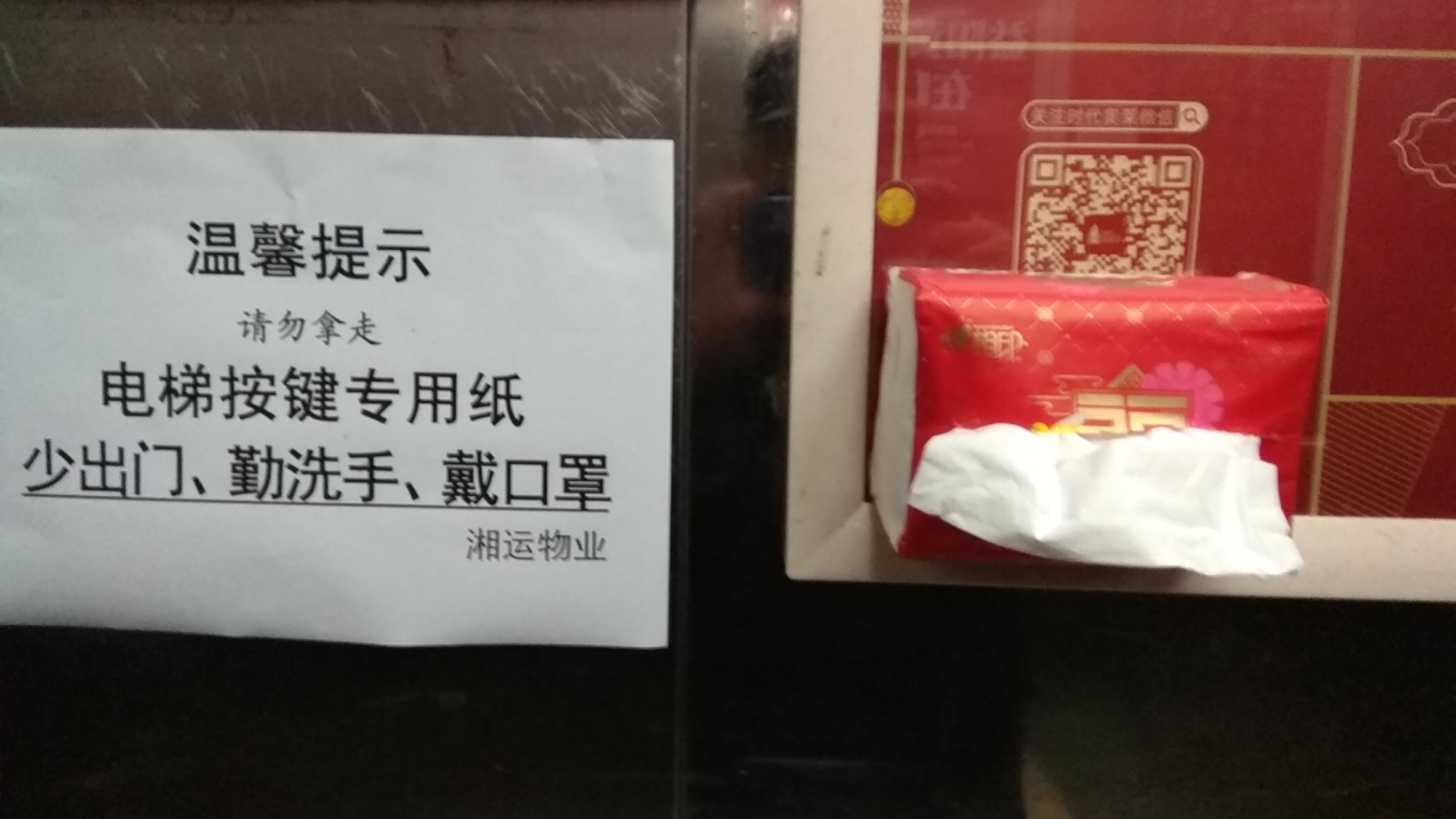 2月1日,在益陽市桃花里小區(qū)的電梯里,出現(xiàn)了一張醒目的“溫馨提示”A4紙,旁邊安放了一盒抽紙巾。這是湘運(yùn)物業(yè)服務(wù)管理公司細(xì)心防控疫情的有力措施。根據(jù)電梯空間小、封閉嚴(yán),一旦有病毒極易被感染的情況,公司經(jīng)理袁笑當(dāng)天一早就安排值班人員采購、準(zhǔn)備好了相關(guān)物資,并第一時(shí)間落實(shí)到位。截止當(dāng)天12:00,桃花里小區(qū)21臺(tái)電梯里都有了如圖所示的便民抽紙。