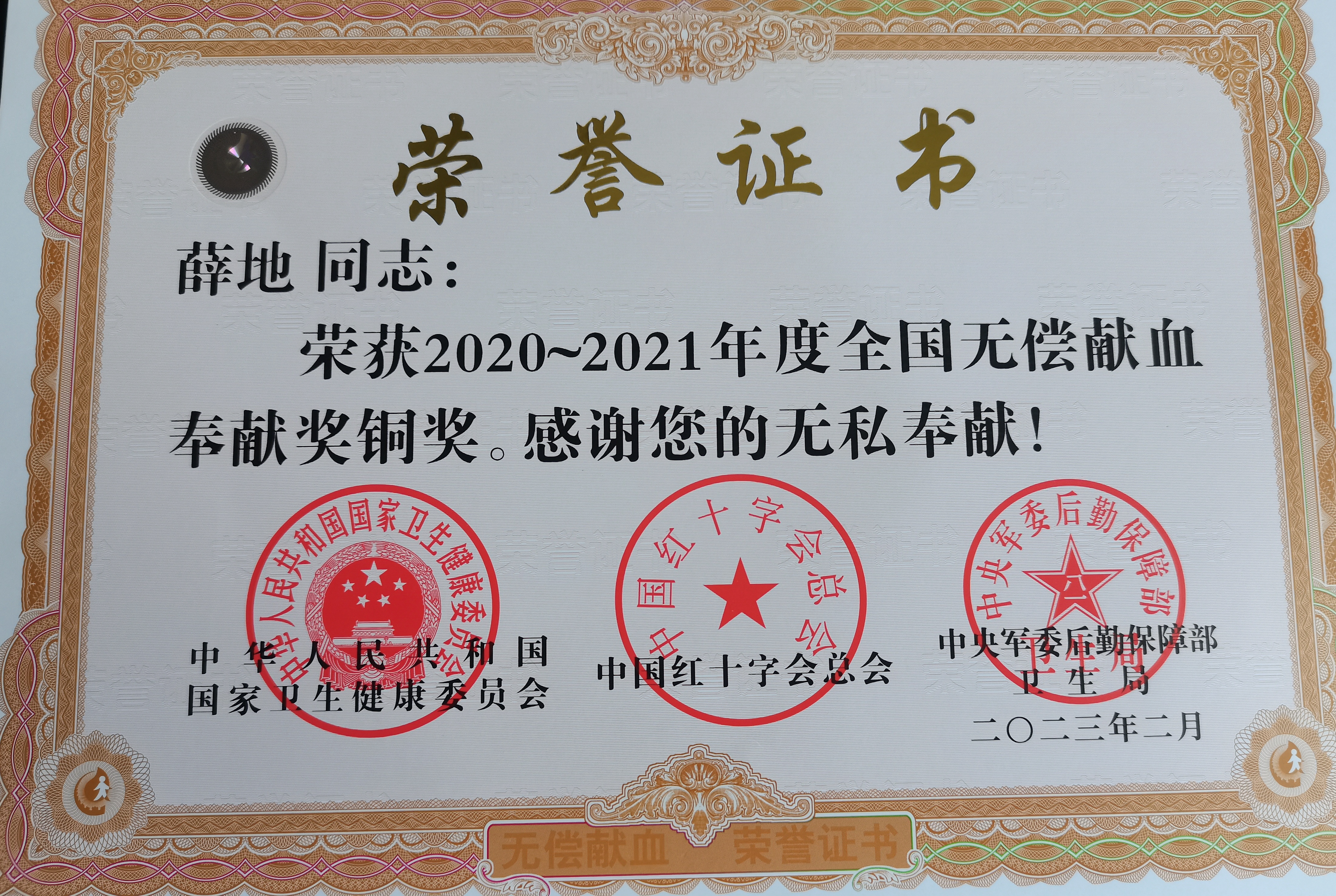 公司員工薛地收到“全國無償獻(xiàn)血奉獻(xiàn)銅獎(jiǎng)”證
